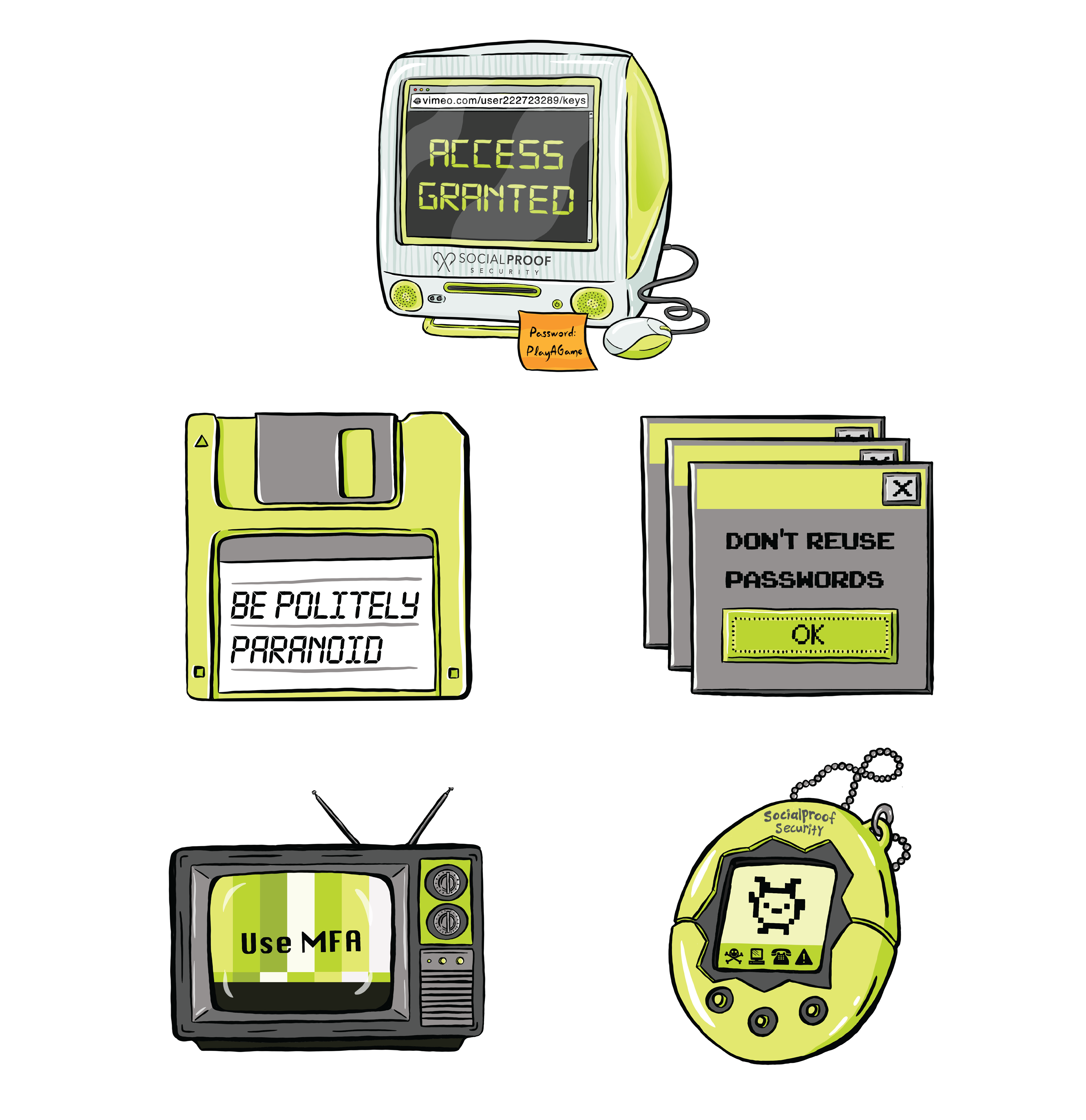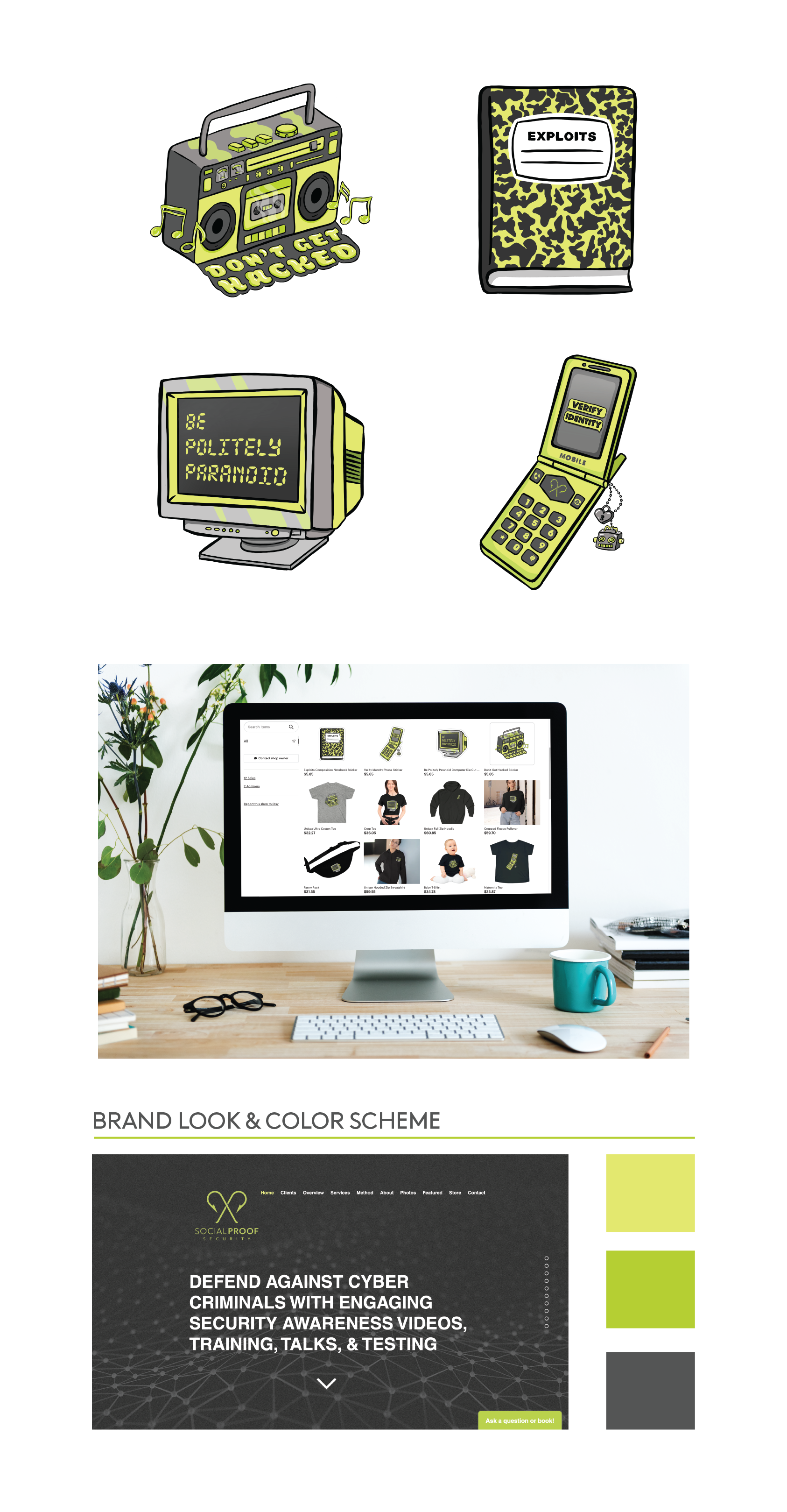 These funky retro designs were made to accommodate various promotional items including apparel and stickers. The designs bring awareness to cyber security through humorous catchphrases while maintaining the brand's identity.