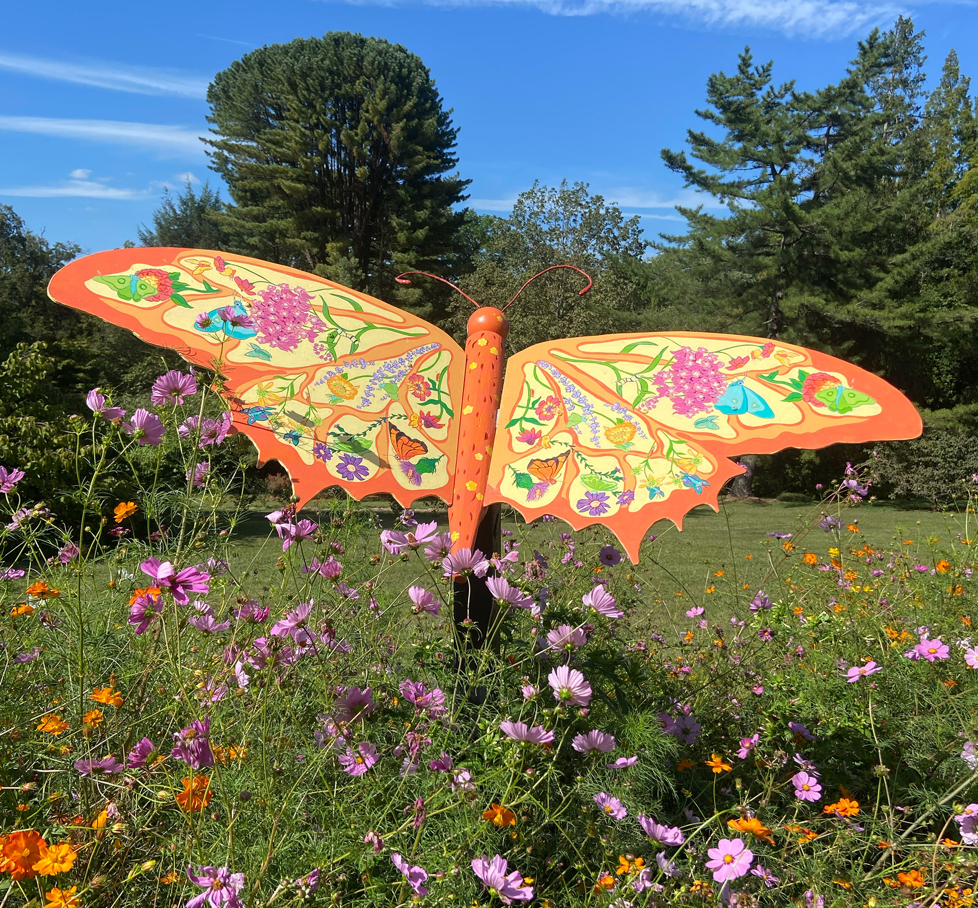 “Wings and Wildflowers” is a colorful tribute to the essential role pollinators play in sustaining our ecosystems. Created for the Morris Arboretum's summer exhibition, Bees, Butterflies & Blooms: A Pollinator Paradise, this whimsical piece illustrates the process of pollination and highlights native, pollinator-friendly plants. The design celebrates both the beauty and the ecological importance of these delicate, mighty creatures.